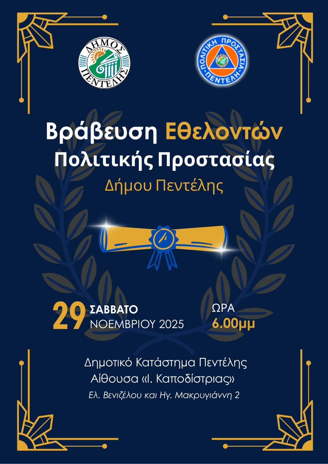 Τιμητική εκδήλωση για μέλη και χορηγούς της Πολιτικής Προστασίας Δήμου Πεντέλης θα πραγματοποιηθεί το Σάββατο 29 Νοεμβρίου 2025 και ώρα: 18:00 στην αίθουσα “Ι. Καποδίστριας” στο Δημοτικό Κατάστημα Πεντέλης (Ελ. Βενιζέλου & Ηγ. Μακρυγιάννη 2).
