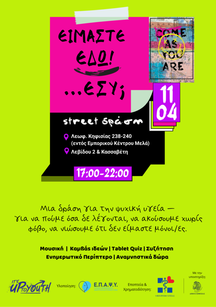 Η Εταιρεία Περιφερειακής Ανάπτυξης Ψυχικής Υγείας (Ε.Π.Α.Ψ.Υ.) σε συνεργασία με τον Δήμο Κηφισιάς πραγματοποιεί την Παρασκευή 11 Απριλίου, από τις 17:00 έως τις 22:00, στην Κηφισιά την πρώτη κοινοτική, street δράση του πιλοτικού προγράμματος «It’s up to Youth».