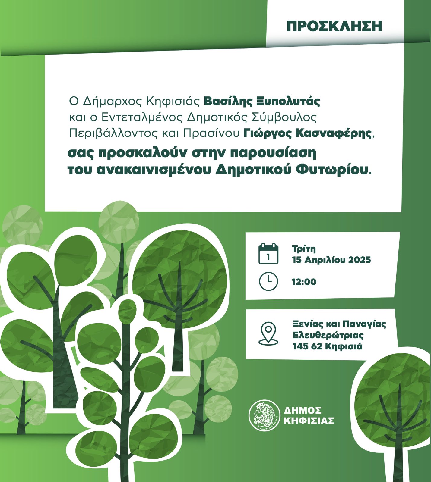 Ο Δήμαρχος Κηφισιάς, Βασίλης Ξυπολυτάς και ο Εντεταλμένος Δημοτικός Σύμβουλος Περιβάλλοντος & Πρασίνου, Γιώργος Κασναφέρης, σας προσκαλούν την Τρίτη 10 Απριλίου, στις 12.00 π.μ. στην παρουσίαση του ανακαινισμένου Δημοτικού Φυτωρίου στην οδό Ξενίας & Παναγίας Ελευθερώτριας, στην Κηφισιά.