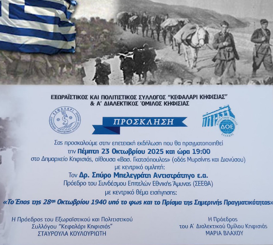 Σας προσκαλούμε στην επετειακή εκδήλωση που θα πραγματοποιηθεί την Πέμπτη 23 Οκτωβρίου 2025 και ώρα 19:00 στο Δημαρχείο Κηφισιάς, αίθουσα “Βασ. Γκατσόπουλος” (Οδός Μυρσίνης και Διονύσου) με κεντρικό ομιλητή: